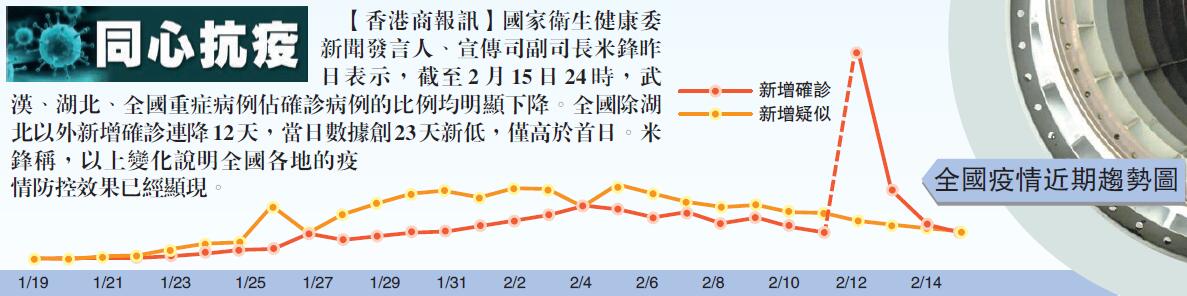 【香港商報网訊】國家衛生健康委新聞發言人、宣傳司副司長米鋒昨日表示,截至2月15日24時,武漢、湖北、全國重症病例佔確診病例的比例均明顯下降。全國除湖北以外新增確診連降12天,當日數據創23天新低,僅高於首日。米鋒稱,以上變化說明全國各地的疫情防控效果已經顯現。