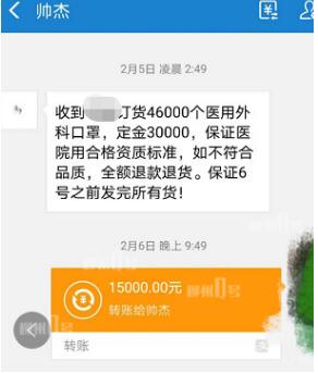 随后,阿丽便通过微信转账的方式,给“帅杰”转了1.5万元,订购三种不同类型的口罩共计5000个。