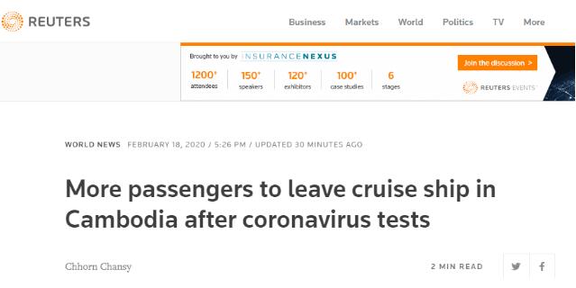 报道称,自“威士特丹”号邮轮(Westerdam)2月14日停靠在柬埔寨西哈努克港省西哈努克港后,数百名乘客得以上岸。然而,一名下船的美国女子搭乘包机抵达马来西亚后,接受病毒检测的结果呈阳性,这使得留在船上或岸上的数以百计的乘客和船员不得不重新接受检查。