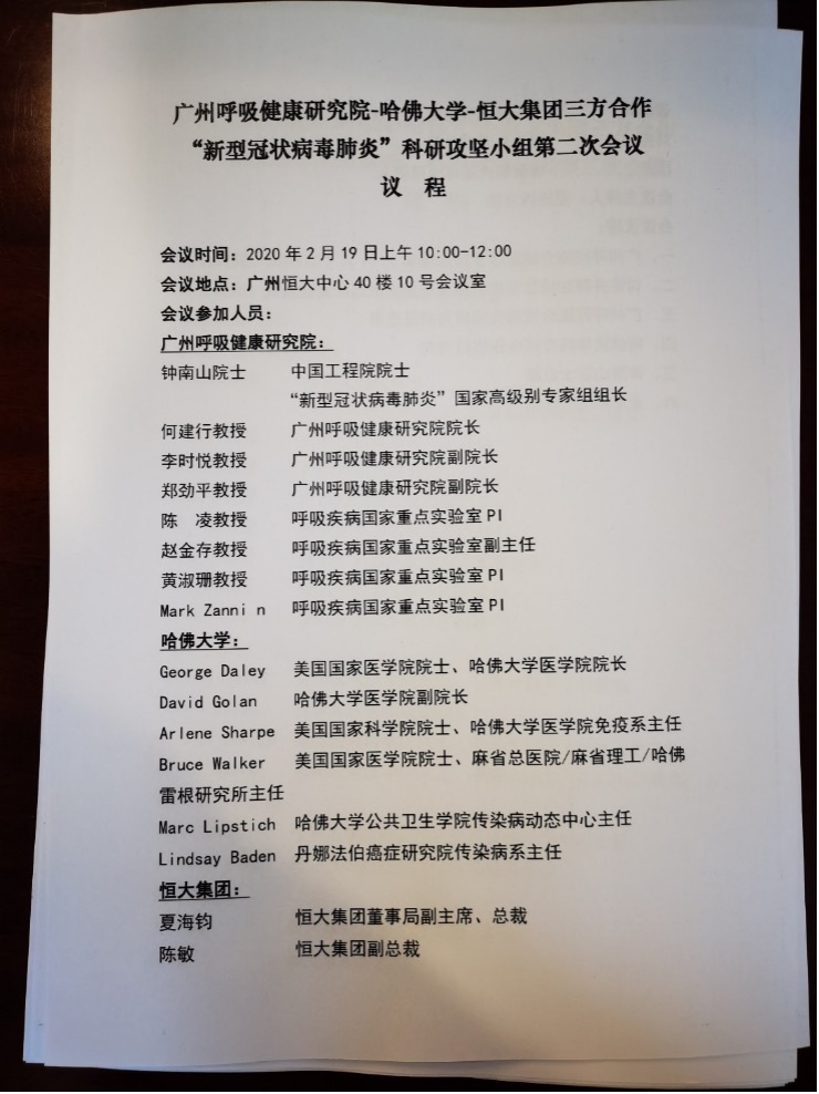 據現場參會名單顯示,出席此次會議的人員可謂是大咖雲集,有鍾南山院士,哈佛大學醫學院院長George Daley院士,哈佛大學醫學院副院長David Golan、免疫系主任Arlene Sharpe院士,哈佛大學雷根研究所主任Bruce Walker院士,哈佛大學傳染疾病動態中心主任Marc Lipstich,丹娜法伯癌症研究院傳染病系主任Lindsey Baden,廣州呼研院院長何建行教授、呼吸疾病國家重點實驗室副主任趙金存教授等。恒大總裁夏海鈞、副總裁陳敏也出席了會議。