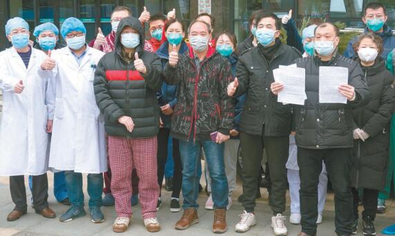 19日,武漢協和醫院西院區31名新冠肺炎重症患者痊癒出院,圖為出院患者與醫護人員合影留念。 新華社