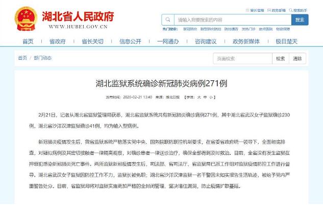 湖北监狱系统确诊新冠肺炎病例271例