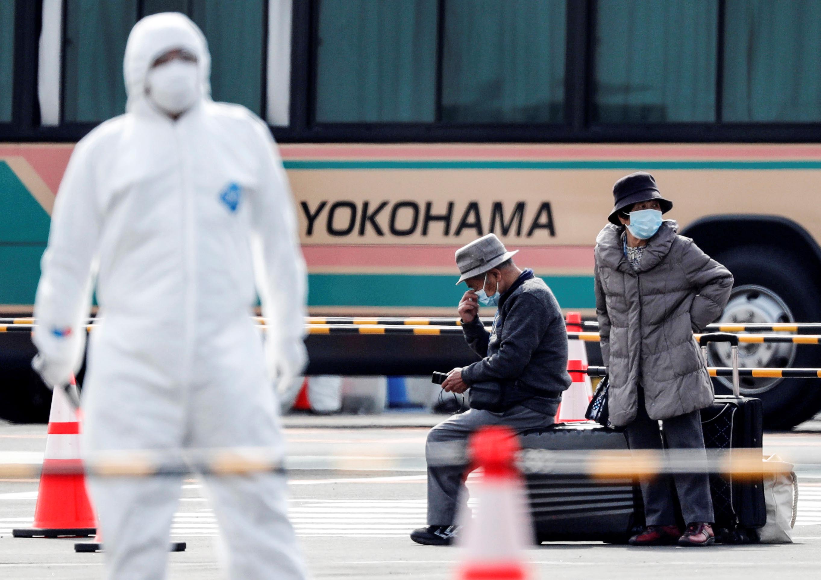 繼19日有443人下船後,20日再有274人被允許下船。圖為下船的乘客等候專車把他們接走。 路透社