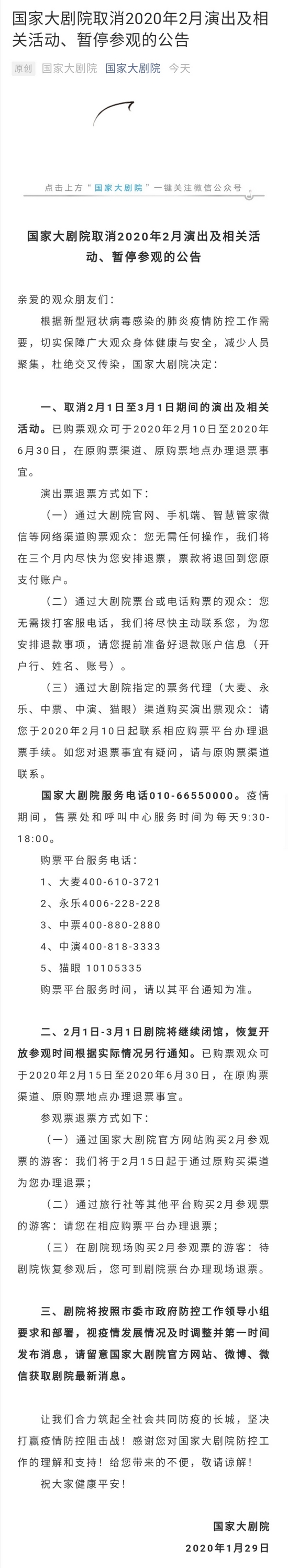 【香港商报网讯】国家大剧院29日发布公告称,根据新型冠状病毒感染的肺炎疫情防控工作需要,切实保障广大观众身体健康与安全,减少人员聚集,杜绝交叉传染,国家大剧院决定,取消2月1日至3月1日期间的演出及相关活动,2月1日-3月1日剧院将继续闭馆,恢复开放参观时间根据实际情况另行通知。