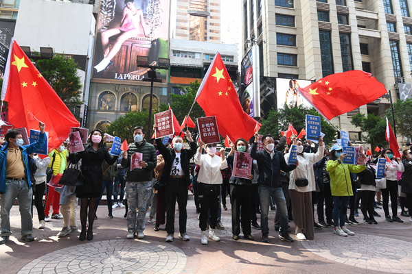 【香港商報网訊】記者周偉立報道:有團體昨日下午到銅鑼灣時代廣場進行快閃唱國歌活動,支持日前被暴徒打傷的「正義姐」藍雪寶。參與人士手持五星旗揮舞,又高叫口號及歌唱多首歌曲。