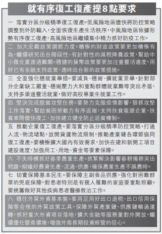 一 落實分區分級精準復工復產。低風險地區儘快將防控策略調整到外防輸入,全面恢復生產生活秩序,中風險地區依據形勢有序復工復產,高風險地區繼續集中精力抓好防疫工作。