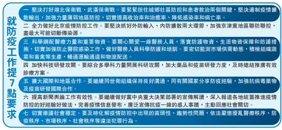 習近平強調,在充分肯定成績的同時,各級黨委和政府必須高度警惕麻痹思想、厭戰情緒、僥幸心理、鬆勁心態,繼續毫不放鬆抓緊抓實抓細各項防控工作,不獲全勝決不輕言成功。對此,習近平提出7點要求(詳見列表)。