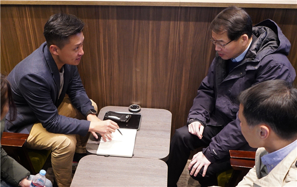 鄭泳舜(左)連日在日本奔波援助鑽石公主號上港旅客。圖為他上周二與到達的保安局副局長區志光商討情況。