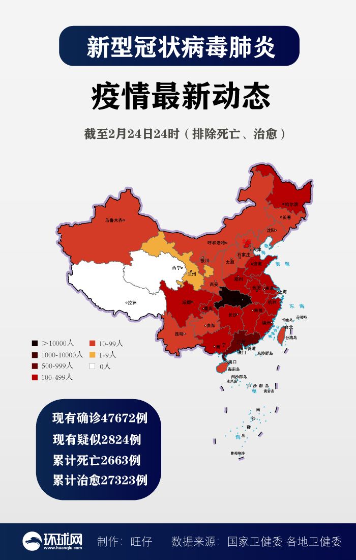 截至2月24日24时,据31个省(自治区、直辖市)和新疆生产建设兵团报告,现有确诊病例47672例(其中重症病例9126例),累计治愈出院病例27323例,累计死亡病例2663例,累计报告确诊病例77658例,现有疑似病例2824例。累计追踪到密切接触者641742人,尚在医学观察的密切接触者87902人。