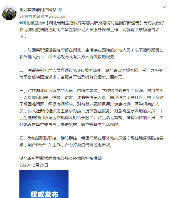 【香港商报网讯】2月25日,湖北省人民政府通过其官方微博发布湖北省新型冠状病毒感染肺炎疫情防控指挥部通告。通告称,要切实做好新冠肺炎疫情防控期间滞留在鄂外地人员服务保障工作。其中,对因离鄂通道管控滞留在湖北、生活存在困难的外地人员,由当地政府及有关方面提供救助服务。对在湖北就业就学的人员,由所在单位、学校提供必要生活保障。对自由职业人员或因出差、探亲、访友、休假等滞留人员,由现住地所在社区(村)及时了解困难问题,积极协调解决。