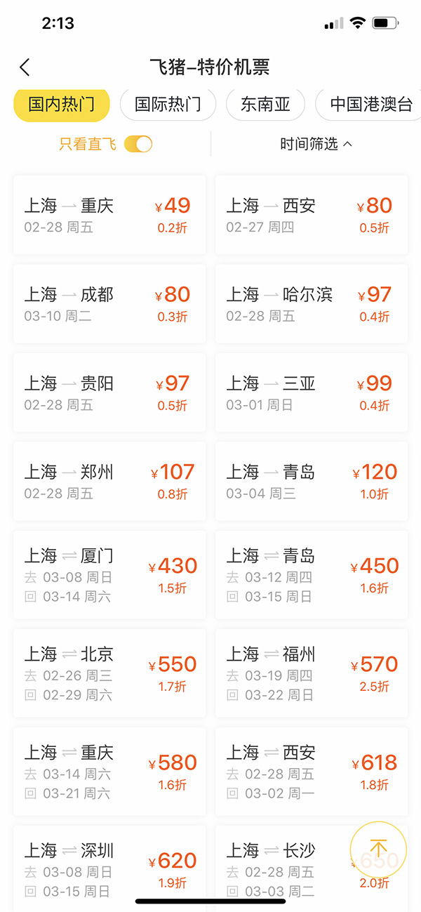 澎湃新闻(www.thepaper.cn)从飞猪特价机票中看到,以上海出发为例,上海至中国内地多个城市机票价格折扣在0.2折至2.5折。如2月28日,上海至重庆、哈尔滨、贵阳等地最低的特价机票都在100元人民币以内。