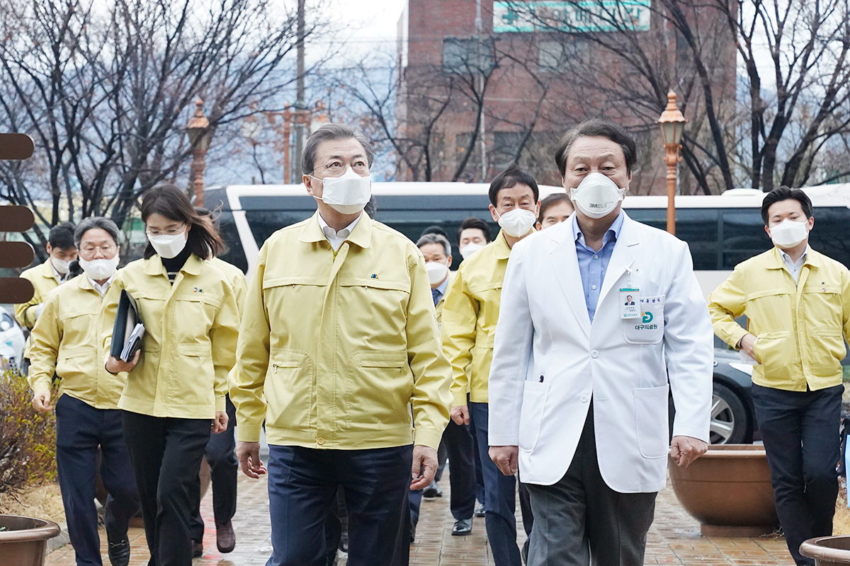 韓國總統文在寅(前排左一)25日到訪大邱,稱力爭本周內控制局勢,讓拐點盡快到來。 中新社