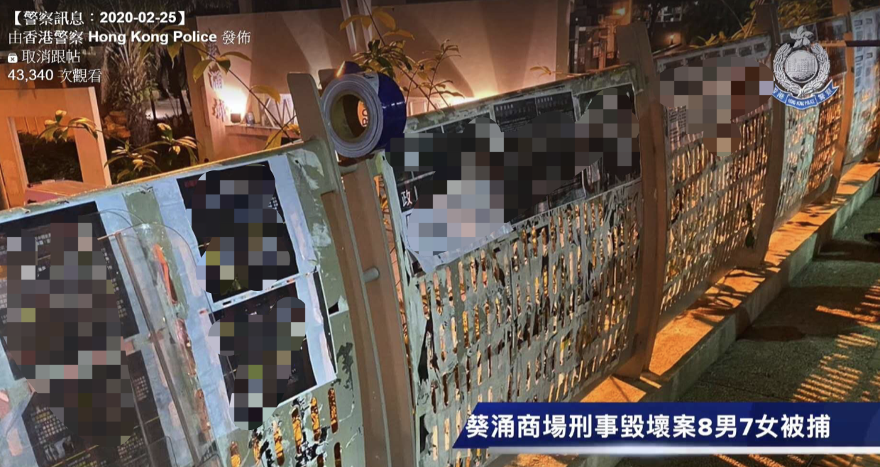 警方透過facebook「香港警察 Hong Kong Police」專頁,發放3宗涉及年輕人的被捕資訊,其中1宗更涉及有老師和學生同時被捕。在帖文中,負責主持的鄒昊亨督察表示,過去數日有多宗涉及年輕人的案件,令人非常擔心。前日(24日)晚上7時許,警方接獲市民報案指,有人在葵涌商場外非法張貼海報。多名警員到場進行調查,其後拘捕8男7女,年齡介乎14至29歲,涉嫌刑事毀壞。被捕人當中包括1名老師,警員在現場檢獲11支膠水及多張海報。