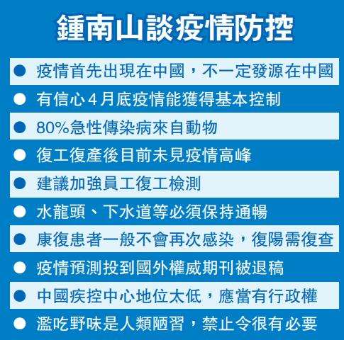 對於各地陸續復工復產,鍾南山認為,目前未見疫情高峰,相信今年4月底中國能基本控制住新冠疫情。