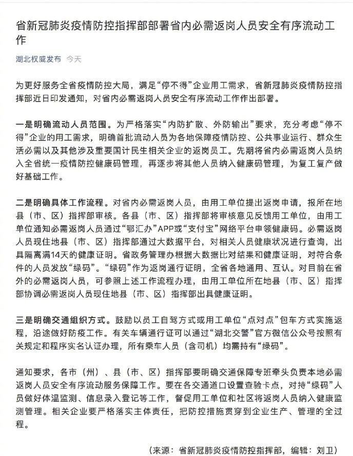 湖北省新冠肺炎疫情防控指挥部对省内必需返岗人员安全有序流动工作作出部署。一是明确首批流动人员为各地保障疫情防控、公共事业运行、群众生活必需及其他涉及重要国计民生相关企业的返岗员工。二是对省内必需返岗人员,由用人单位提出返岗申请,返岗人员需申领健康码。三是鼓励以员工自驾方式或用工单位“点对点”包车方式实施返程,沿途做好防疫工作。所有乘车人员(含司机)均需持有“绿码”。