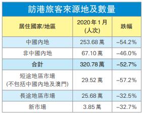 根據旅發局最新公布數據顯示,1月訪港旅客數目為320.78萬人次,按年大減52.7%,其中內地旅客為253.67萬人次,按年大減54.2%;當中內地過夜旅客大減59.3%。計及今年1月,訪港旅客數目已連跌7個月。