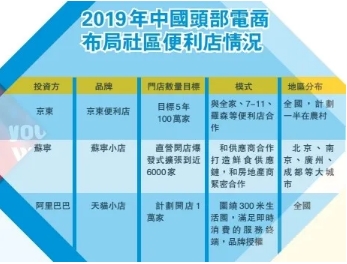 隨著線上銷售增長面臨瓶頸,阿裡、京東、蘇寧等頭部電商紛紛佈局線下便利店市場。京東計劃5年內擴張100萬家京東便利店;蘇甯建立蘇寧小店品牌,由實體門店和獨立APP結合而成;阿裡天貓小店計劃開店1萬家。
