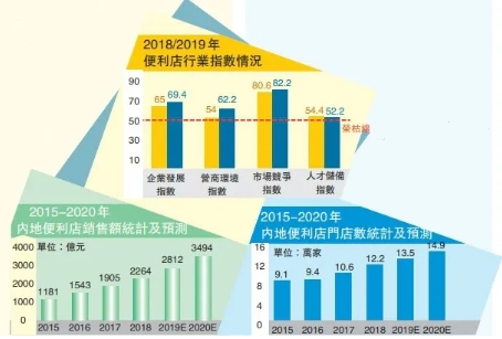 近年來,內地便利店發展快速,據統計數據顯示,2019年便利店行業的企業發展指數、營商環境指數、市場競爭指數以及人才儲備指數均在榮枯線以上。其中,企業發展指數為69.4、營商環境指數為62.2、市場競爭指數為82.2、人才儲備指數為52.2。