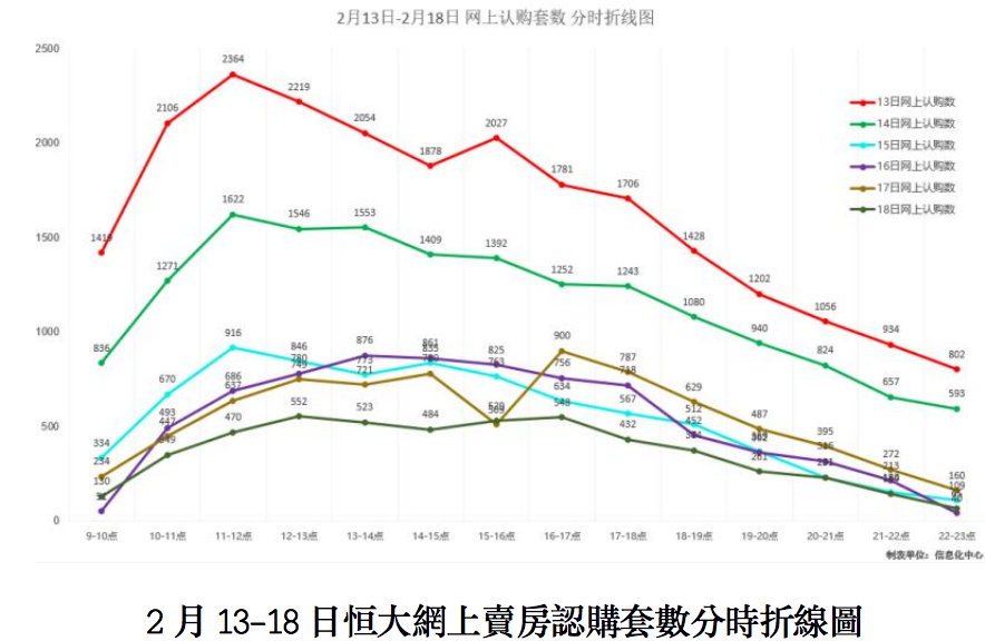 劉雪飛還介紹,為了及時瞭解“網上賣房”成交情況,恒大對2月13日-29日以來網上認購情況進行即時資料追蹤,細緻到每個小時的網上認購套數都能清晰掌握。