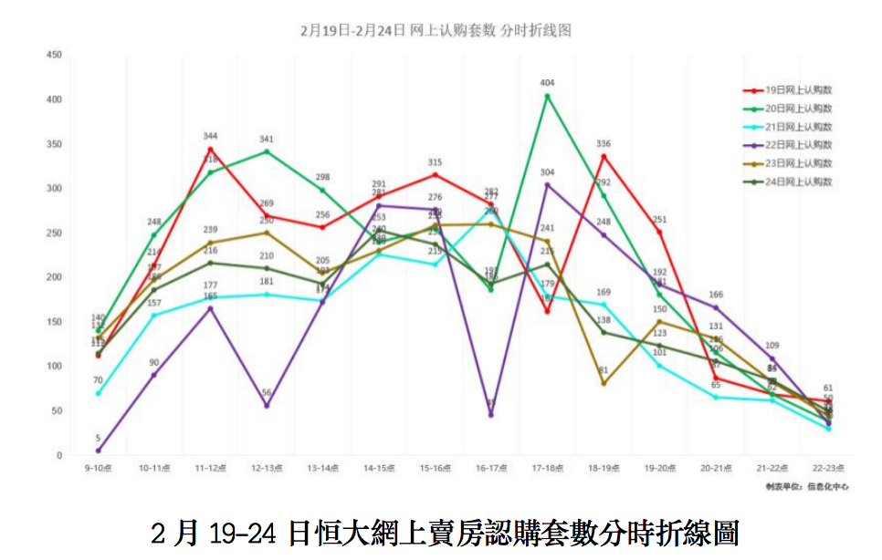 2月19-24日恒大網上賣房認購套數分時折線圖