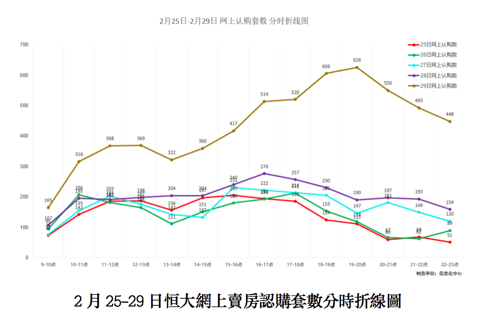 2月25-29日恒大網上賣房認購套數分時折線圖