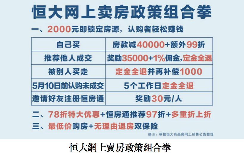 隨著3月“小陽春”旺季的到來,恒大再次放出大招。3月1日,恒大啟動促銷“組合拳”:全國樓盤78折特大優惠、“恒房通”推薦額外97折,以及根據樓棟去化情況和付款方式的不同額外折扣,在即將到來的“小陽春”再次搶跑市場。