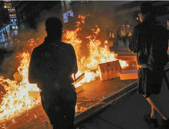 示威者在旺角街頭堵路及縱火。 路透社
