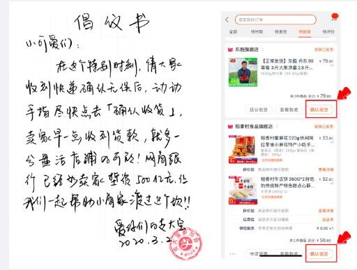 与此同时,支付宝也在发出倡议称,此刻对小商家来说,现金流就是生命,网商银行把家底都掏了,为他们免费垫资500亿,让其一发货就能收到钱,也斗胆发出号召:请大家收货满意之后,第一时间主动确认收货,商家早一分钟收到钱,就早一分活下来的可能。