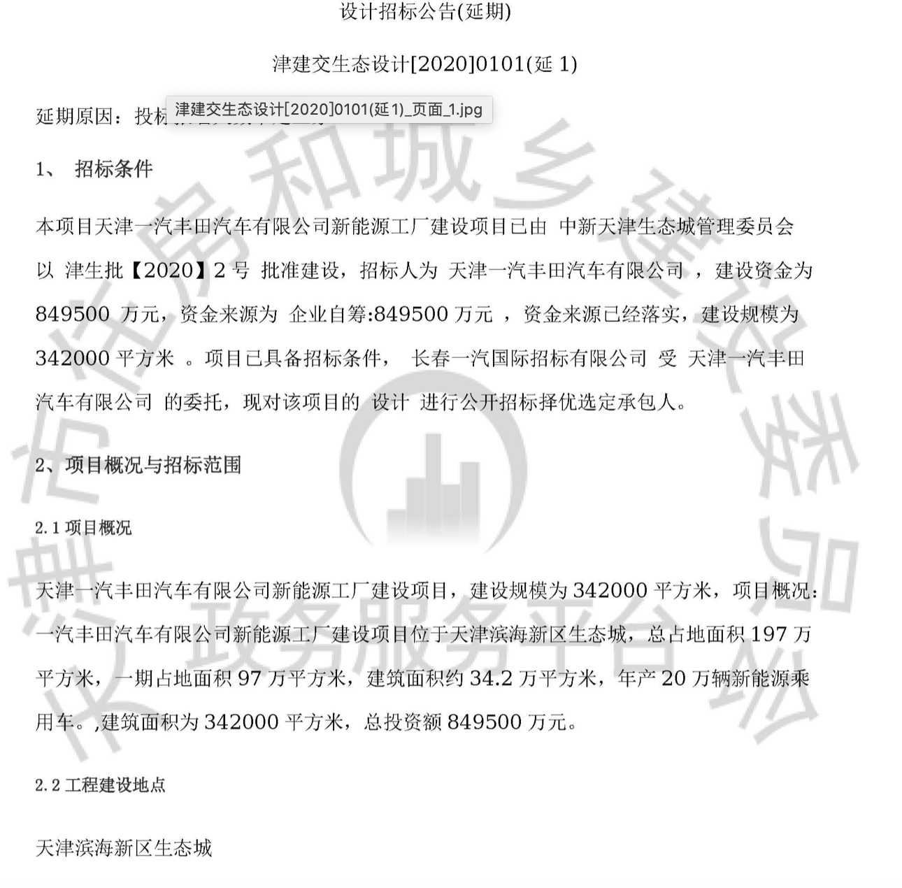 澎湃新闻记者查询发现,中新天津生态城管理委员会1月20日发布的项目招标文件显示,丰田汽车和一汽集团计划投资84.95亿元,在天津滨海新区生态城新建一座新能源汽车工厂,该工厂已被天津生态城管理委员会批准建设。该工厂计划占地面积为34.2万平方米,年产20万辆新能源乘用车,其中包括纯电动汽车、插电式混合动力汽车以及燃料电池汽车。