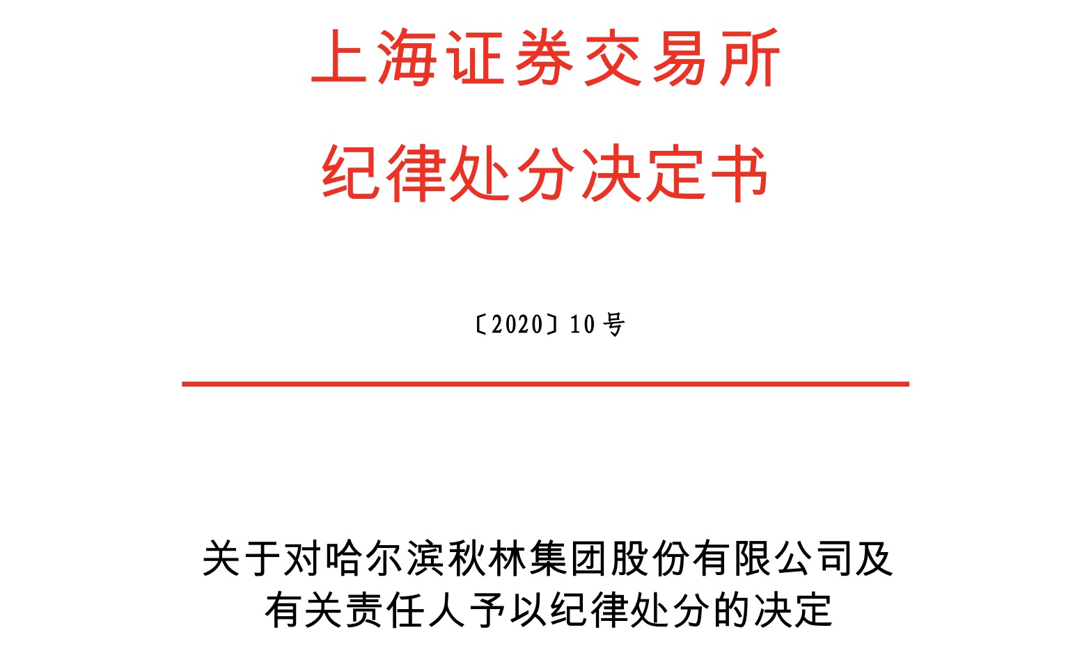 鉴于上述违规事实和情节,经上交所纪律处分委员会审核通过,根据《股票上市规则》第17.2条、第17.3条、第17.4条和《上海证券交易所纪律处分和监管措施实施办法》的有关规定,上交所做出如下纪律处分决定:对哈尔滨秋林集团股份有限公司、时任董事长李亚、时任副董事长李建新予以公开谴责,并公开认定李亚、李建新十年内不适合担任上市公司董事、监事和高级管理人员;对时任董事、总经理兼财务总监潘建华,时任公司董事兼副总裁侯勇,时任董事兼董事会秘书隋吉平,时任董事兼副总裁曲向荣,时任公司独立董事陶萍、任枫、白彦壮,时任公司监事李岩、杨庆国、梁澍,时任公司副总裁季文波、孙晓春予以公开谴责。