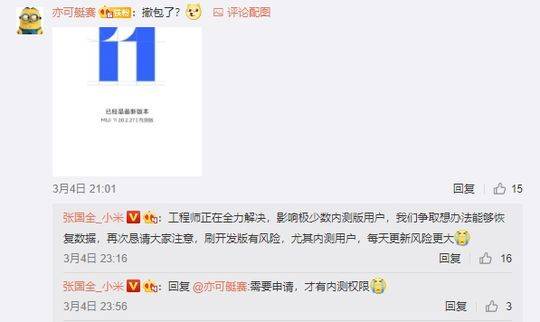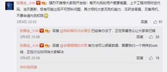 他还提醒:强烈不推荐大家刷开发版!每天内测的用户更要慎重,上千工程师同时进代码,当天更新,极有可能出现不可预料问题,再次拜托大家无刷机能力,无研发背景,无备用机,不要申请内测权限。