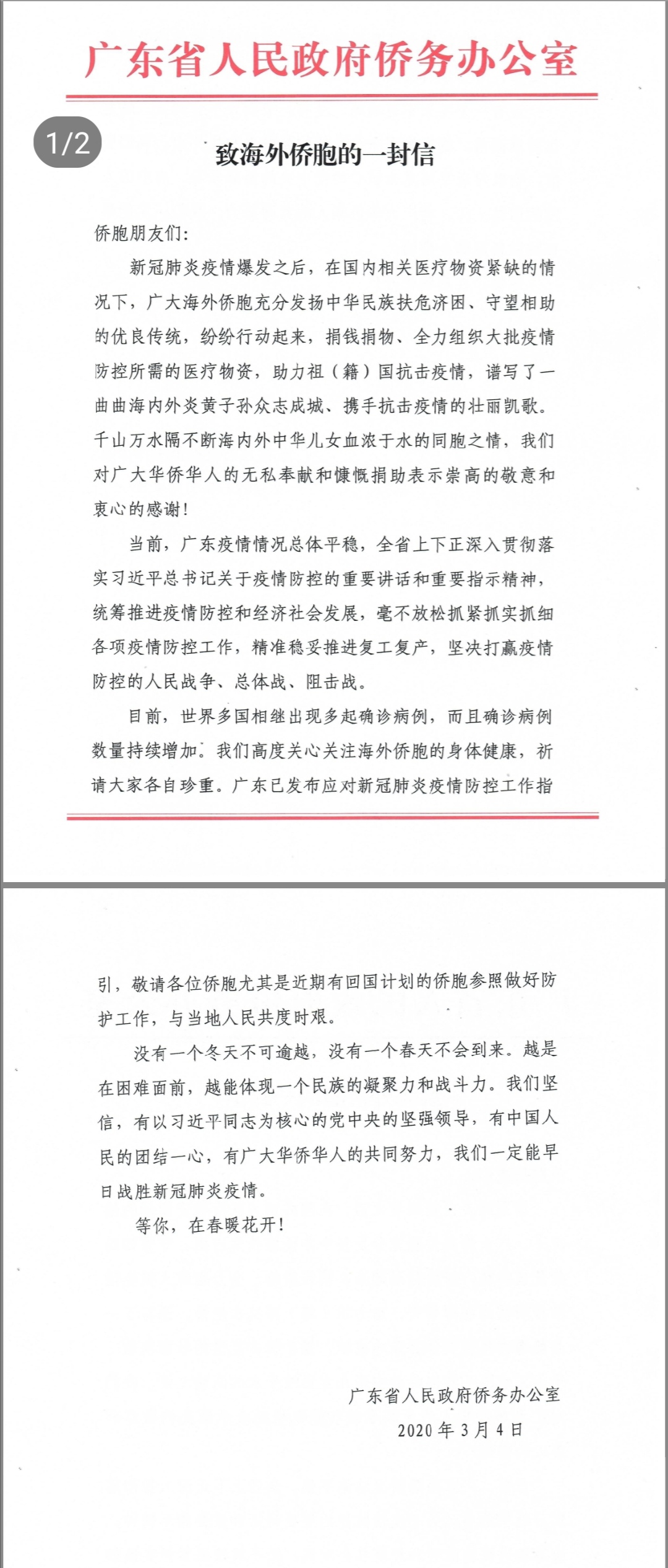 3月4日,廣東省人民政府僑務辦公室發出「致海外僑胞的一封信」,感謝廣大海內外僑胞在這場猝不及防的戰「疫」中,捐款捐物,奔走於世界各地千方百計尋找國內急需的醫療物資,助力祖國抗擊疫情,譜寫了一曲曲海內外炎黃子孫眾志成城、攜手抗擊疫情的壯麗凱歌。同時祈請廣大海外僑胞各自珍重,在世界各國相繼出現新型冠狀病毒確認病例期間做好防護,共克時艱。