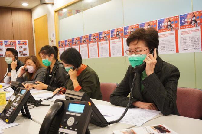 林鄭月娥昨日來到工聯會「寄藥行動熱線中心」,了解中心的運作情況,並親身接聽部分求助電話,了解他們的訴求。接線中心義工亦分享了自己工作過程中的困難,希望特首可以協助解決。林鄭月娥讚揚熱線中心人員的專業和高效,全力以赴協助在內地港人。