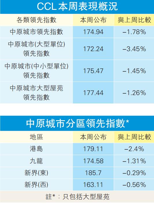 中原城市領先指數(CCL)本周報174.94點,按周跌1.78%,連跌3周共2.18%。中原城市大型屋苑領先指數(CCL Mass)最新報177.44點,按周跌1.26%,連跌3周共1.73%。CCL(中小型單位)報175.47點,按周跌1.45%,連跌2周共1.90%。三大整體指數同樣重返2019年3月時水平,齊創50周新低。至於反應二手豪宅的CCL(大型單位)報172.24點,創54周新低,按周跌3.45%,連跌4周共3.83%。