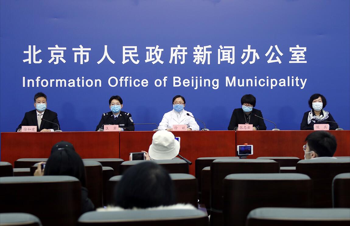 3月8日北京市第44場新冠肺炎防控工作新聞發佈會現場,北京市委宣傳部副部長、市新聞辦主任徐和建(左一)主持發佈會