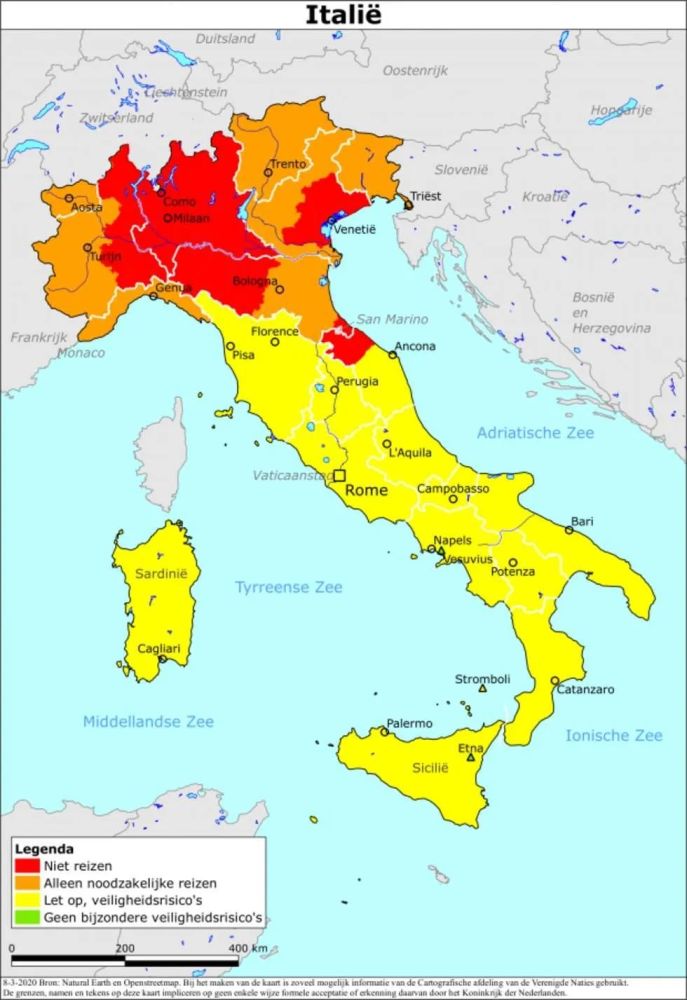 下图显示了对于意大利北部大部分地区旅行建议:“仅必要时候才旅行”,也就是橙色。