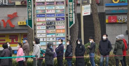 图为3月1日,在首尔钟路区一家超市外,民众排起长队等待购买口罩。 中新社