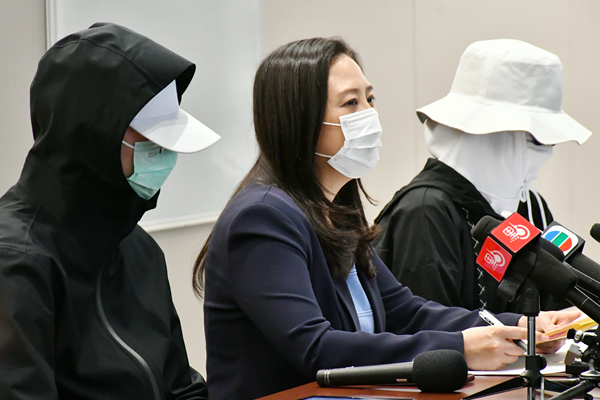 葛珮帆(中)陪同被騙苦主召開記者會,公布購買口罩被騙案情。記者馮瀚文攝