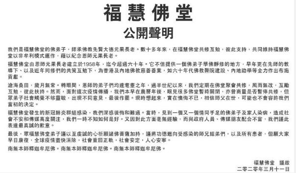 佛堂稱,在農曆新年後,曾因應疫情商討應否暫停共修,但因社會觸覺不夠靈敏,出現不同意見而作罷,回想事件感到懊悔不已。