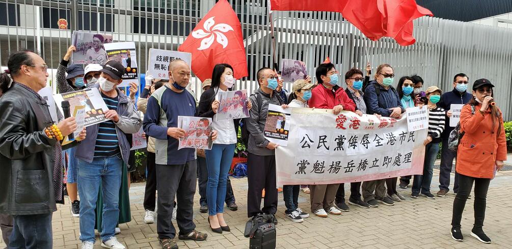 【香港商报网讯】新任區議員李文浩及「公民黨」劉家衡,張貼「藍絲與狗不得入內」等侮辱字句在議員辦門外,甚至灑潑漂白水傷害市民,在本港引发争议。团体「愛港聯盟」今日游行示威,促「公民黨」黨魁楊岳橋出來教仔。该团体表示,他们拿出誠意態度來服務市民街坊!