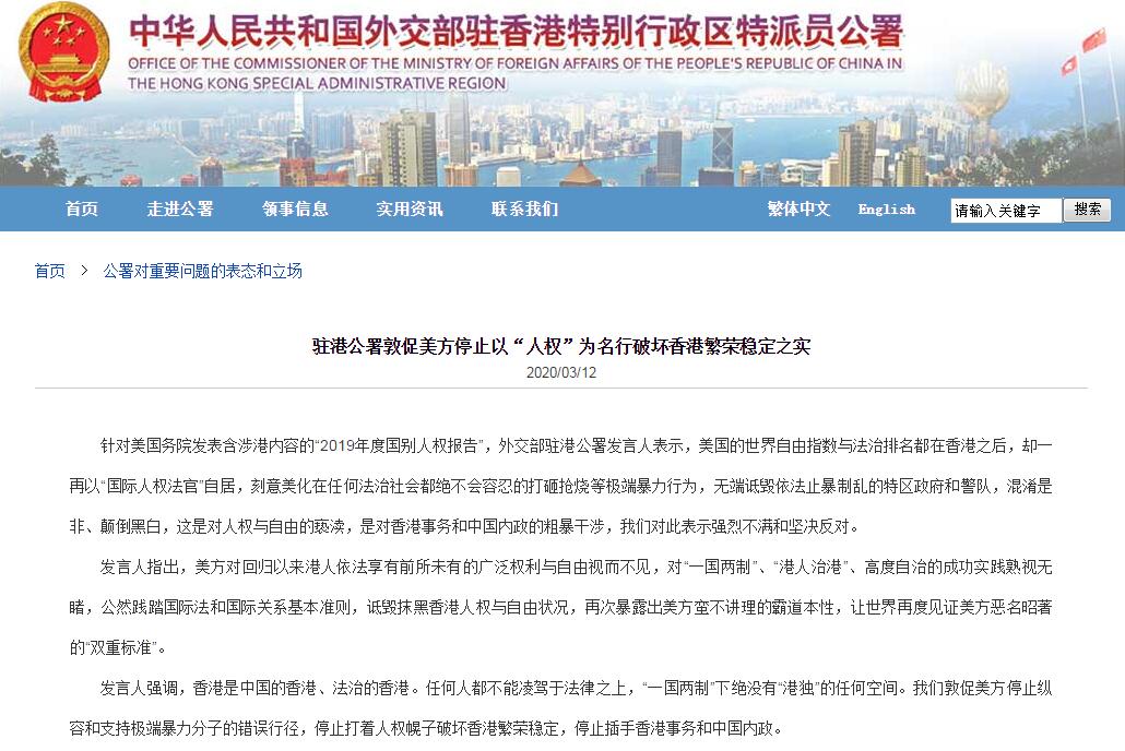 发言人指出,美方对回归以来港人依法享有前所未有的广泛权利与自由视而不见,对“一国两制”、“港人治港”、高度自治的成功实践熟视无睹,公然践踏国际法和国际关系基本准则,诋毁抹黑香港人权与自由状况,再次暴露出美方蛮不讲理的霸道本性,让世界再度见证美方恶名昭著的“双重标准”。