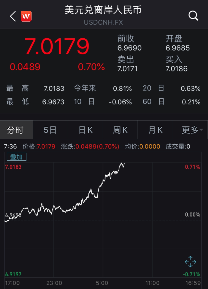 【香港商报网讯】12日晚间,在岸人民币兑美元跌破7关口,日内跌超500个基点,现报7.0015;离岸人民币兑美元短线跳水,稍早前破7,现报7.0179。中国外汇交易中心的数据显示,人民币兑美元中间价下降29点,报6.9641,创逾一周新低。英镑兑美元下挫逾百点,日内跌逾0.7%,现报1.2721。欧元兑美元日内跌幅扩大至0.5%,现报1.1213。