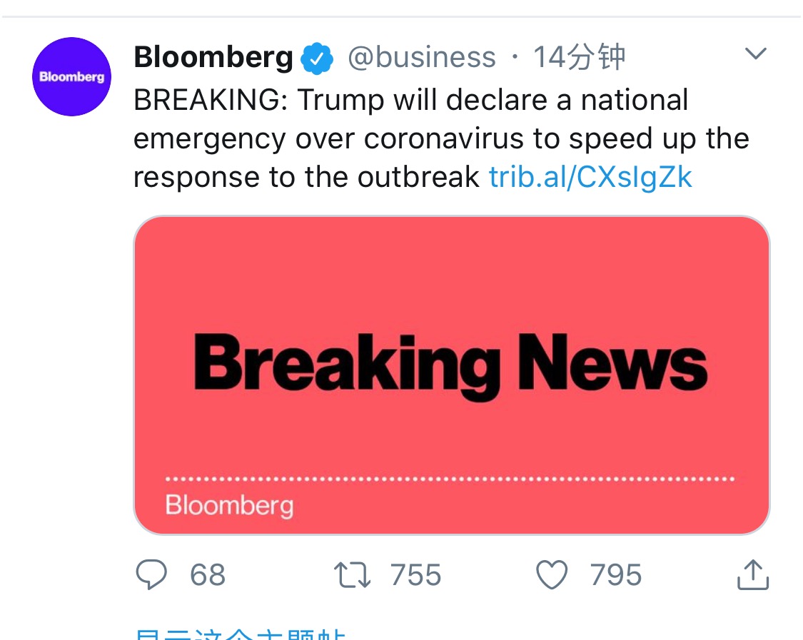 【香港商报网讯】彭博社刚刚报道,美国总统特朗普将宣布国家进入紧急状态,以加速应对新冠病毒疫情。 特朗普先前发布一条推特,预告他将在当地时间13日下午3点召开新闻发布会,主题是“新冠病毒”。此外,据人民日报消息,巴西总统博索纳罗在其社交账号表示,其新冠病毒检测呈阴性。