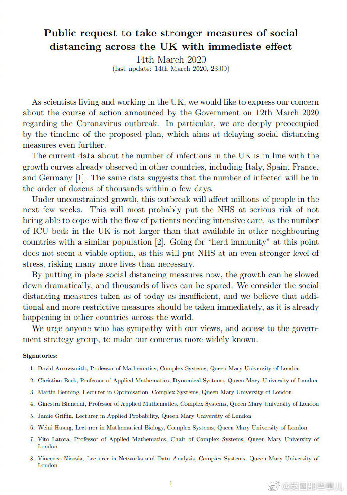 他们分别在传染病领域, 心理和行为科学领域 以及免疫学领域 发出了三封公开信,表达对目前Boris对抗疫情策略的担忧,希望英国能立刻采取更严格的社交隔离措施。