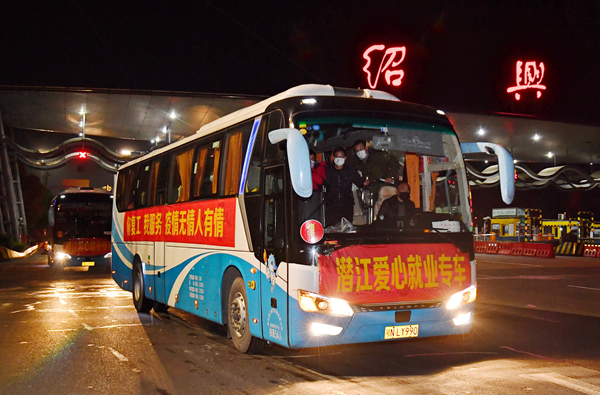 中國第一趟接返在鄂員工「就業大巴車」15日抵達紹興。中新社