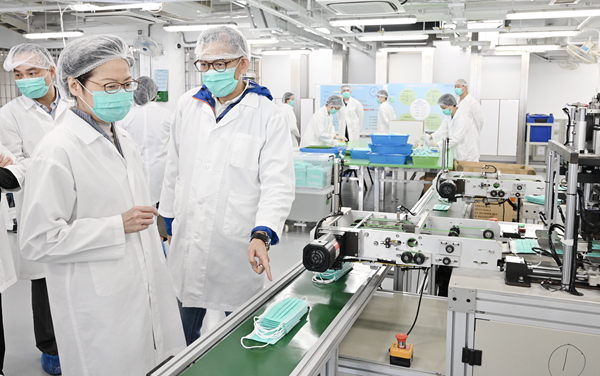 林鄭月娥昨在保安局副局長區志光陪同下到訪羅湖懲教所,聽取懲教署署長胡英明介紹羅湖懲教所在原有工場旁改建、昨日正式投產的口罩生產線。事實上,為應對疫情,懲教署自1月初起已多次增加生產口罩,將生產量由2019年每月平均約110萬個逐步增加至現時約250萬個。工場現時24小時運作,而為應付所需人手,除在囚人士外,懲教署超過1200名休班及退休人員自願擔任義工參與生產,最年長的已80多歲。在他們的努力下,預計將會陸續投產的多條新生產線會進一步提升懲教署整體口罩生產量至每月540萬個。