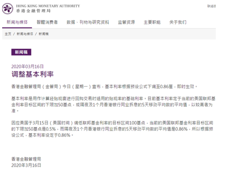 据澳门金管局官网消息,自2020年3月16日起,基本利率下调64个基点至0.86%。