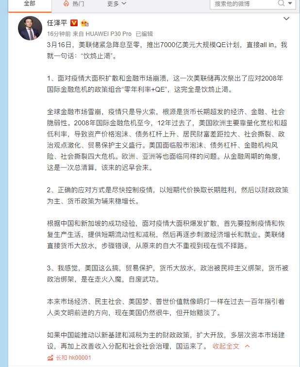 恒大集团首席经济学家任泽平16日发文点评美联储紧急降息指出,“美联储直接allin,我就一句话:饮鸩止渴。”任泽平认为,美国面临股市泡沫、债务杠杆、金融机构风险、社会撕裂四大危机。欧洲、亚洲等也面临同样的问题。从金融周期的角度,这是一次总清算,该来的迟早会来。正确的应对方式是尽快控制疫情,以短期代价换取长期胜利,然后以财政政策为主、货币政策为辅来稳增长。