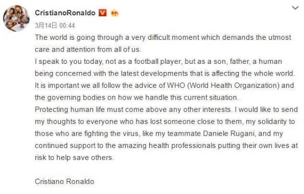 【香港商报网讯】面对肆虐的疫情,作为世界足球巨星,C罗在社交网络上发文声援各地抗击疫情,他说道: