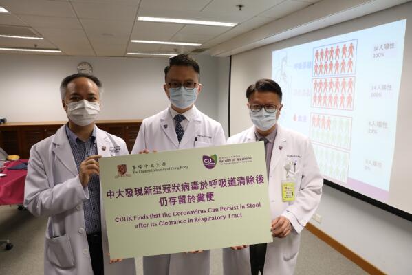 中大醫學院從本港14名已確診新冠肺炎患者中採集來自呼吸道、血液、尿液及糞便等300多個樣本,分析病毒於人體的分布。結果顯示,痰液樣本所含病毒量最高,較深喉唾液樣本的病毒量高300倍;深喉唾液樣本和糞便樣本發現到的病毒量相若。研究亦發現,不論患者的病情輕重,所有確診者的糞便樣本都被驗出帶有病毒,其中3人的痰樣本和深喉唾液即使已無病毒,仍於1至2日內在其糞便樣本中找到病毒。